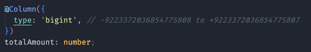 - TypeORM ๊ณต์ ๋ฌธ์์์๋ ๋์์๋ฏ์ด, ์ํฐํฐ๋ฅผ ๋ง๋ค ๋ bigint๋ก ์ปฌ๋ผ ํ์ ์ ์ง์ ํ๋ฉด ์ํฐํฐ๋ก ๋ณํํ ๋๋ string์ผ๋ก ๋ณํ๋ฉ๋๋ค. (PostgreSQL ๊ธฐ์ค)
