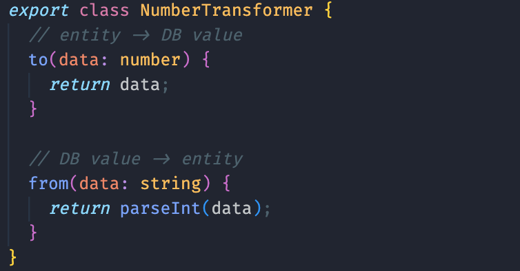 - TypeORM ๊ณต์๋ฌธ์๋ฅผ ์ดํด๋ณด๋ฉด transformer๋ฅผ ์ง์ ํ๋ ๋ฐฉ๋ฒ์ด ์์ต๋๋ค.