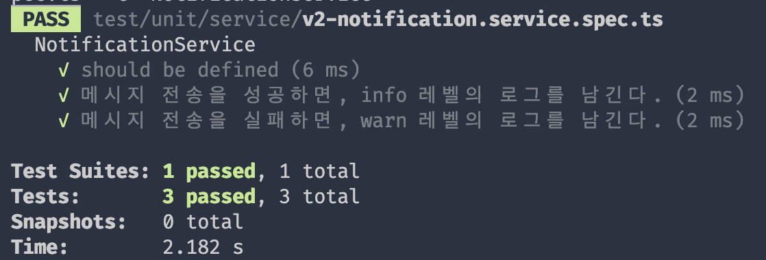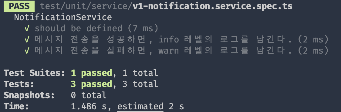 test('๋ฉ์์ง ์ ์ก์ ์ฑ๊ณตํ๋ฉด, info ๋ ๋ฒจ์ ๋ก๊ทธ๋ฅผ ๋จ๊ธด๋ค.', async () => {