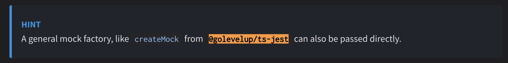 useMocker๋ฅผ ํตํด @golevelup/ts-jest์ createMock์ด๋ผ๋ mock factory๋ฅผ ์ ๋ฌํ ์ ์๋ค๊ณ ํฉ๋๋ค.