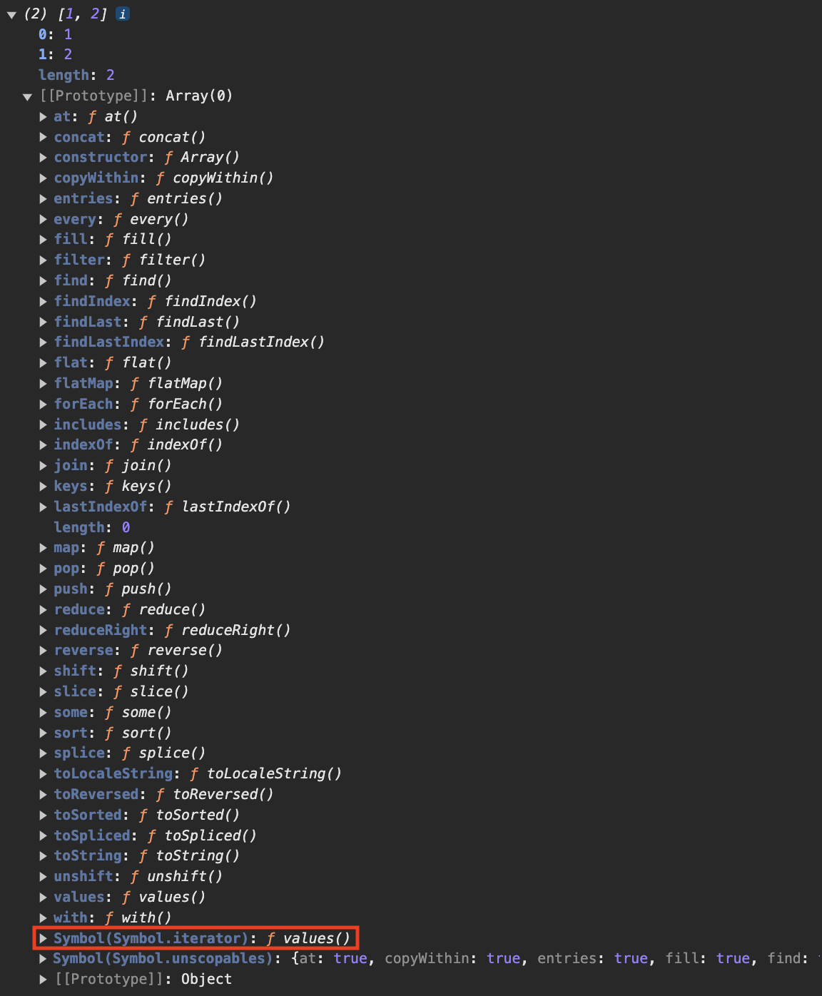 - ๋ฐฐ์ด์ ์ ์ธํ์ฌ ์ดํด๋ณด๋ฉด Symbol.iterator ์์ฑ์ด ์์ต๋๋ค.